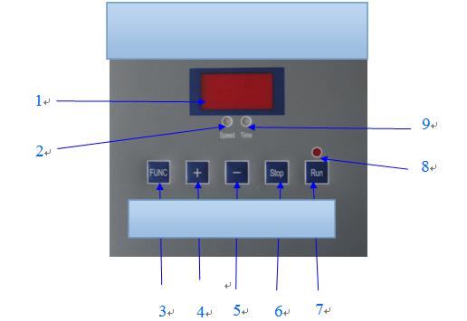 1.數顯窗 2.轉速指示燈 3.功能轉換鍵 4. 增加鍵 5.減少鍵 6. 停止鍵 7. 運行鍵 8. 運行指示燈 9.運行時間指示燈
