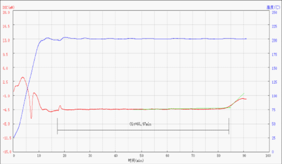 如圖所示即為該聚乙烯(PE)管道的氧化誘導期時間(OIT),OIT=66.97min。